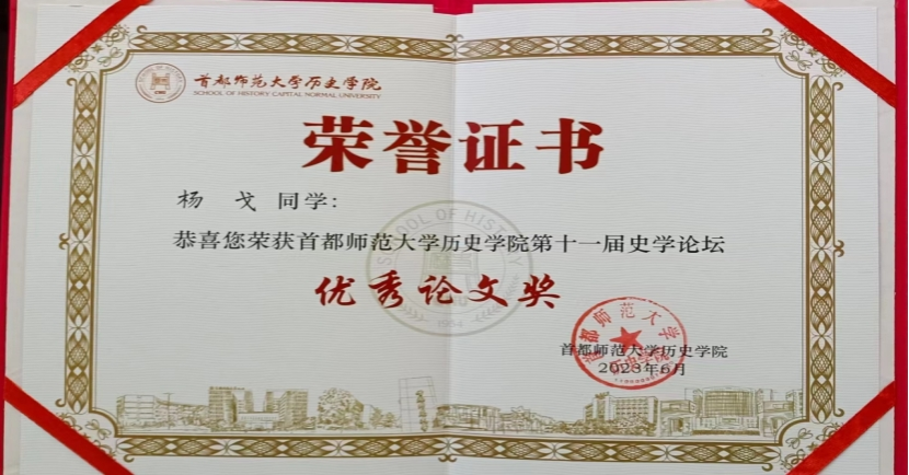 1、2023年6月由21级硕士研究生杨戈撰写的论文《汉魏六朝史评中的汉桓帝形象》获首都师范大学betway西汉姆联官方网站第十一届史学论坛优秀论文奖