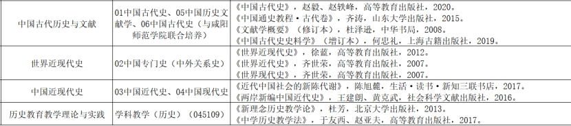 中国史各方向主要考核中国史各领域的基本内容、研究理念与方法、研究现状等问题。学科教学(历史)专业主要考核历史公司产品的有关理论与实践问题。各方向参考书目如下: