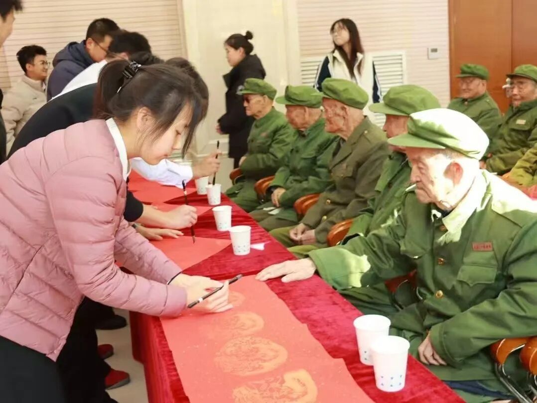 在互动环节,同学们还向在场的每位老英雄敬赠亲手制作的剪纸和书法作品,一笔一画都彰显出同学们的崇敬与感激之情。随后学子们与革命前辈一同前往院内,围坐交流、认真聆听前辈讲述戎马生涯中的光荣事迹,在闲话家常间传递温暖陪伴。